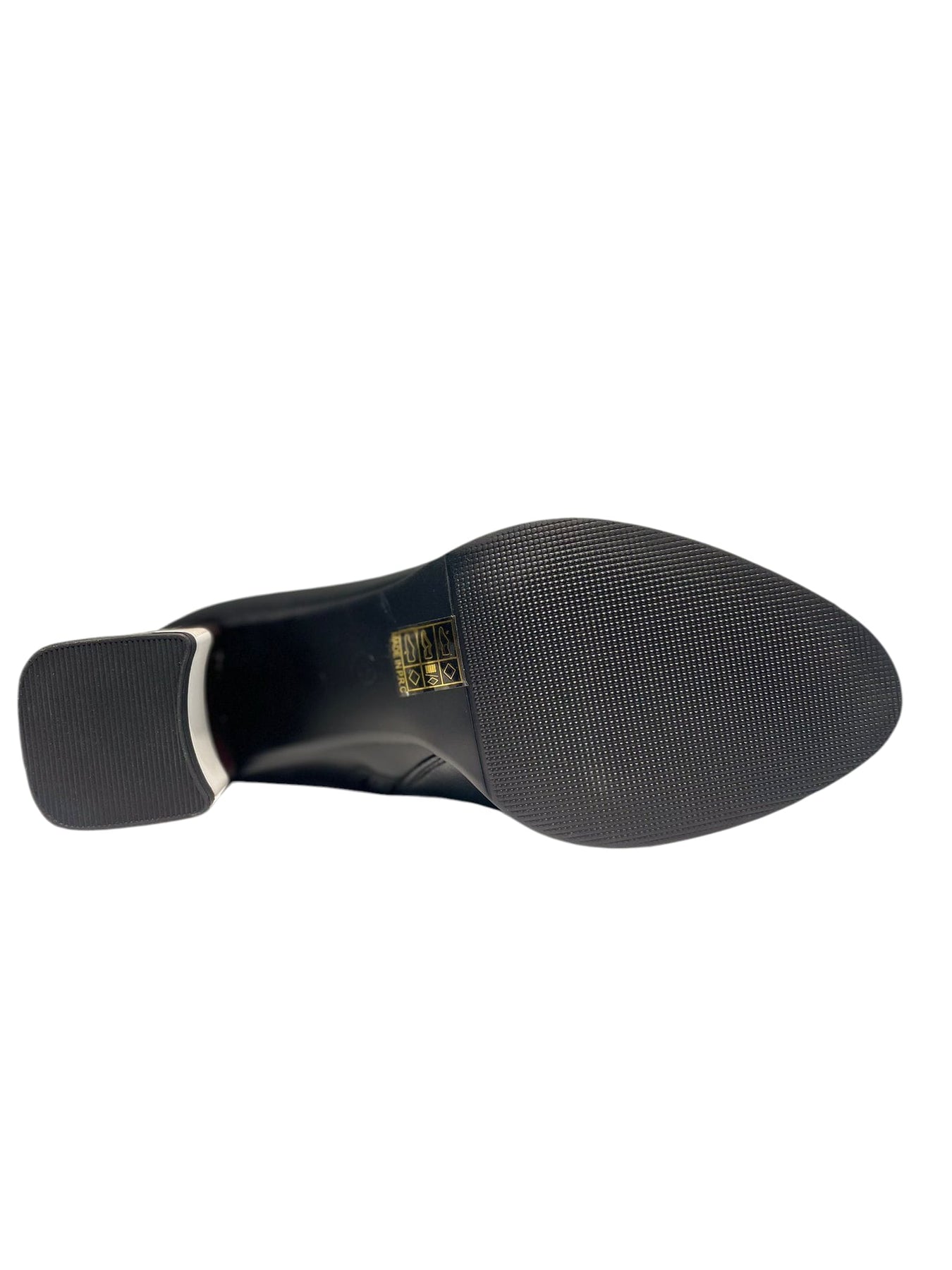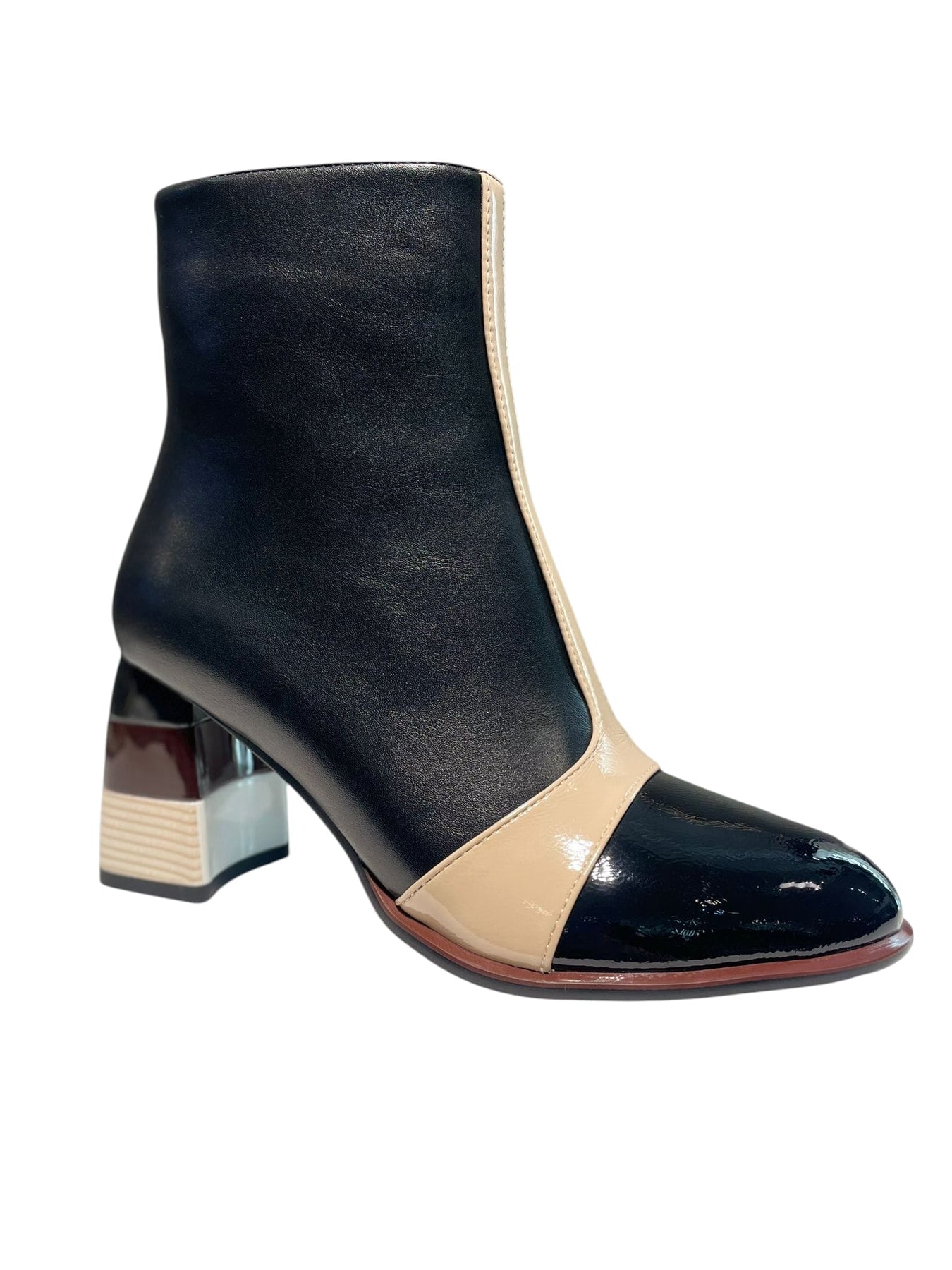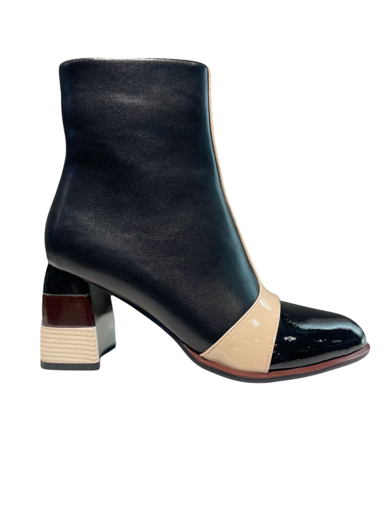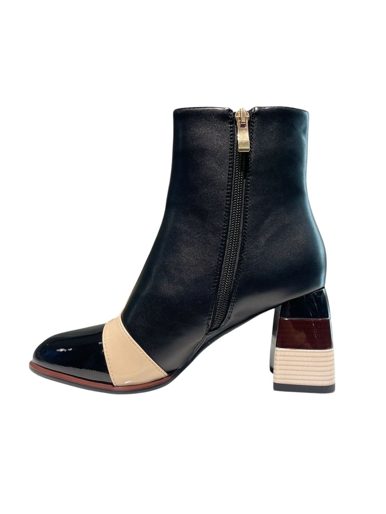 Explore the distinctiveness of this black vegan leather ankle boot, designed with a 3-inch heel showcasing a gradient of black, brown, and beige hues. The black patent leather toe is highlighted by a fine beige patent stripe, offering a refined and contemporary contrast. This shoe blends striking design with classic sophistication, ensuring your look stands out.