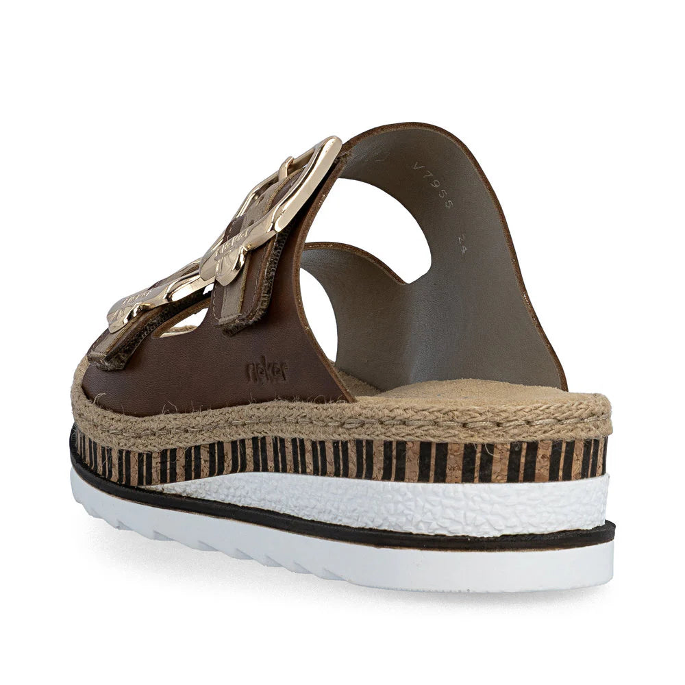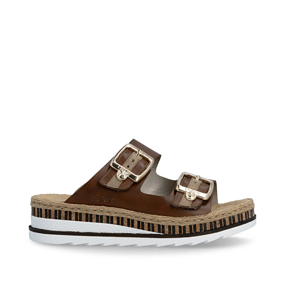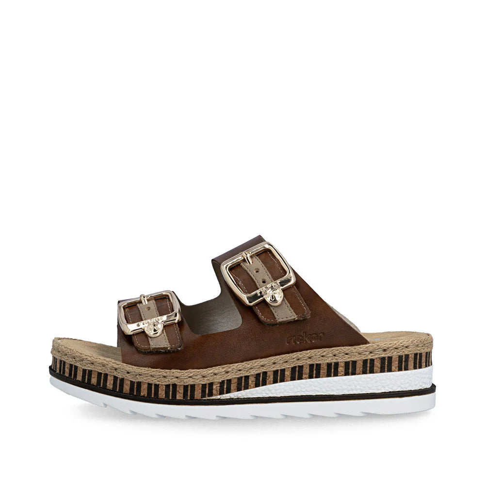 Pure comfort and luxury! These brown Rieker mules made of smooth leather offer you style, function and comfort all at once. The stitchdown construction makes this shoe robust and the sole particularly flexible. The double hook-and-loop fastener allows for quick donning and keeps the shoe securely in place. The trendy buckle gives the shoe that certain something. The shock-absorbing and very light sole with wedge heel cushions every step. In addition, the cover sole is extra soft. The slim fit provides additional support. Step by step to summer happiness.