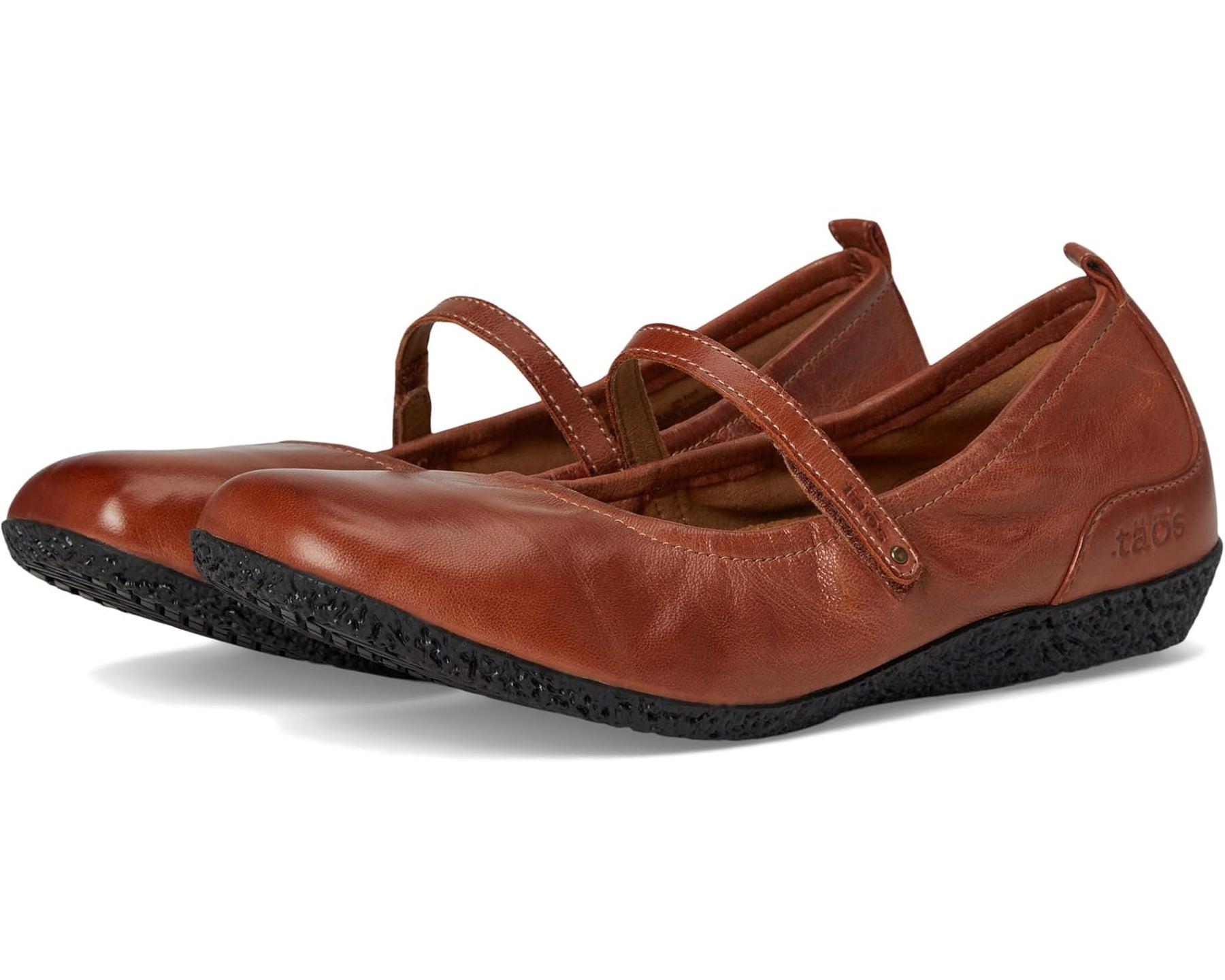 The Taos Footwear Babble offers a luxurious, soft ballet flat design featuring timeless clean lines and a playful leather Mary Jane hook-and-loop strap for added charm. It includes a gentle elasticized topline and a flattering rounded square toe shape, paired with the Curves & Pods removable polyurethane footbed covered in microfiber for comfortable support. Crafted with a full grain leather upper, these flats provide excellent arch and metatarsal support. The flexible, durable rubber outsole enhances mobility, while the ankle pull tab ensures easy on and off. Lined with microfiber. Imported. Heel height: 3/4 inch. Measurements may vary by size.