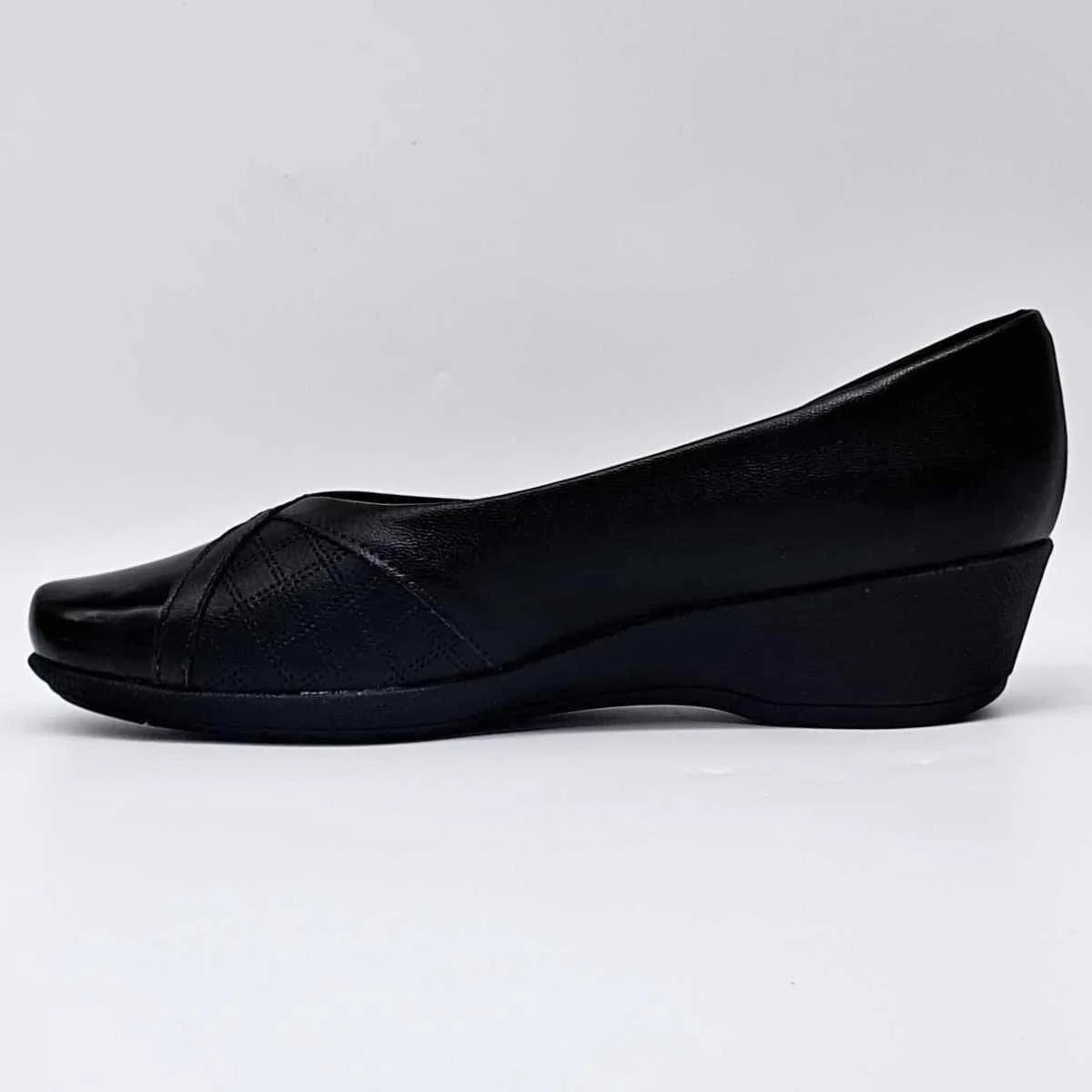 Piccadilly women's shoe made of synthetic napa leather. Round toe design in patent leather, side cutouts in soft quilted stretch napa leather that better adjusts to the feet and provides greater comfort for those with bunions. 4 cm high wedge heel, non-slip rubber sole and textile lining.