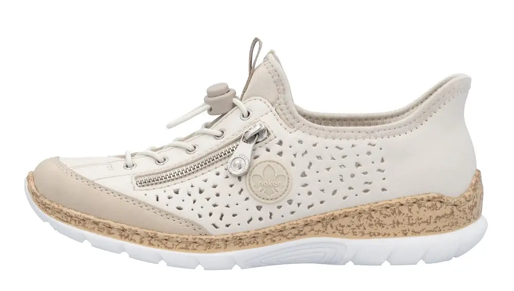 Fashion meets function in the Rieker N42V3. A stylish and comfortable slip-on sneaker designed for effortless everyday wear. With a flexible stitchdown construction and lightweight materials, this beige beauty combines durability with a soft, breathable fit. The elastic shaft collar and side band ensure easy on-and-off, while the decorative zipper adds a modern flair. Finished with a shock-absorbing wedge sole and extra-cushioned MemoSoft insole, it's the perfect go-anywhere shoe for the new season.